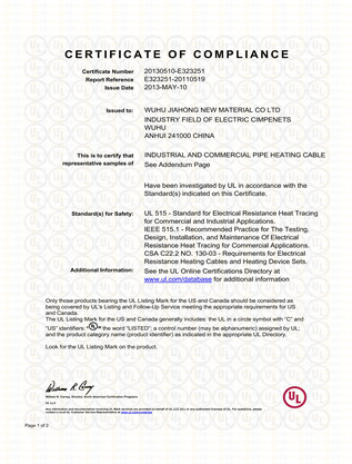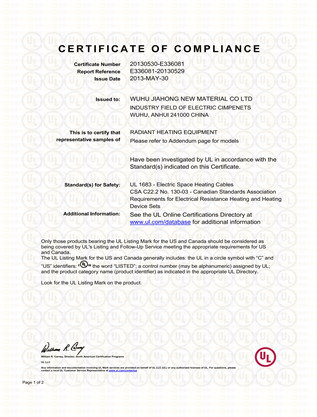 地面供暖发热电缆UL认证